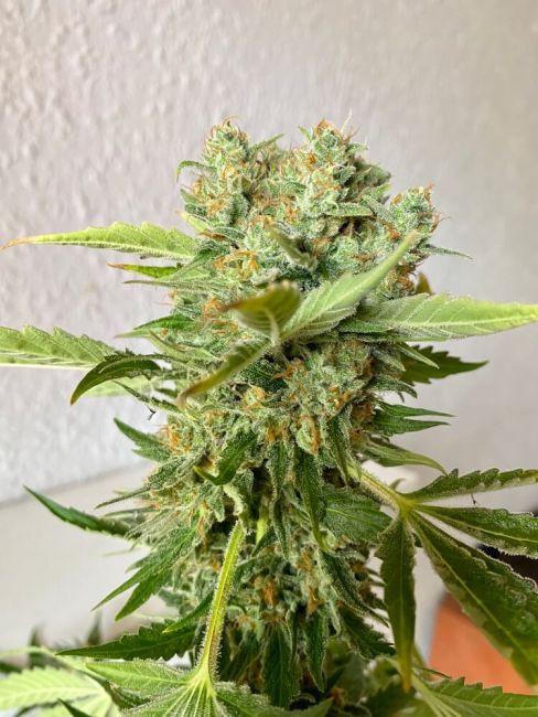Suitable for cultivation indoors and outdoors, this plant has a moderate appetite for nutrients and will finish in 7 weeks of florescence indoors or alternatively harvest at the end of September in northern latitudes. It is a hardy plant with good resistance to moulds. Its short flowering period means that it is a very suitable strain to grow outdoors in more marginal climate areas as it will be finished before the bad weather arrives. The buds are a bright, lime green flecked with orange hairs and with a generous coating of white "platinum" resin crystals.