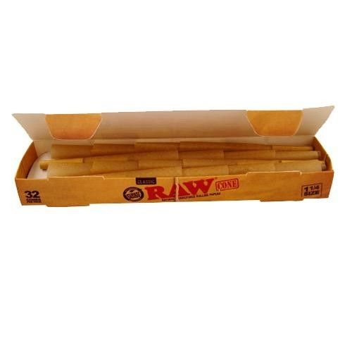 RAW Classic Pre-Rolled 1 1/4 Cones are packed in boxes of 32 cones. Cones offer a fast and easy way to make a cigarette. All that has to be done by the smoker is to fill it with smoking material. They are made from the usual high-quality RAW Classic paper and contain a tip.