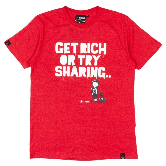 'Get Rich or Try Sharing' Premium Weight Men's T-Shirt in Red is produced from a fine blend of 55% Organic Hemp with 45% Organic Cotton for a better environment.
