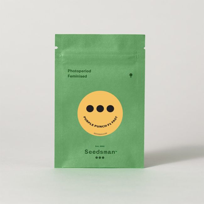 Purple Punch F1 FAST, a 75% indica strain known for its robust growth, large yields, and high potency is derived by crossing Purple Punch with (GMO Cookies x Legend OG). It's characterized by its fruit and fuel aroma. Purple Punch F1 FAST plants, preferring warm climates, can reach heights of over 200cm outdoors. Indoors, flowering times are between 7 and 9 weeks.
